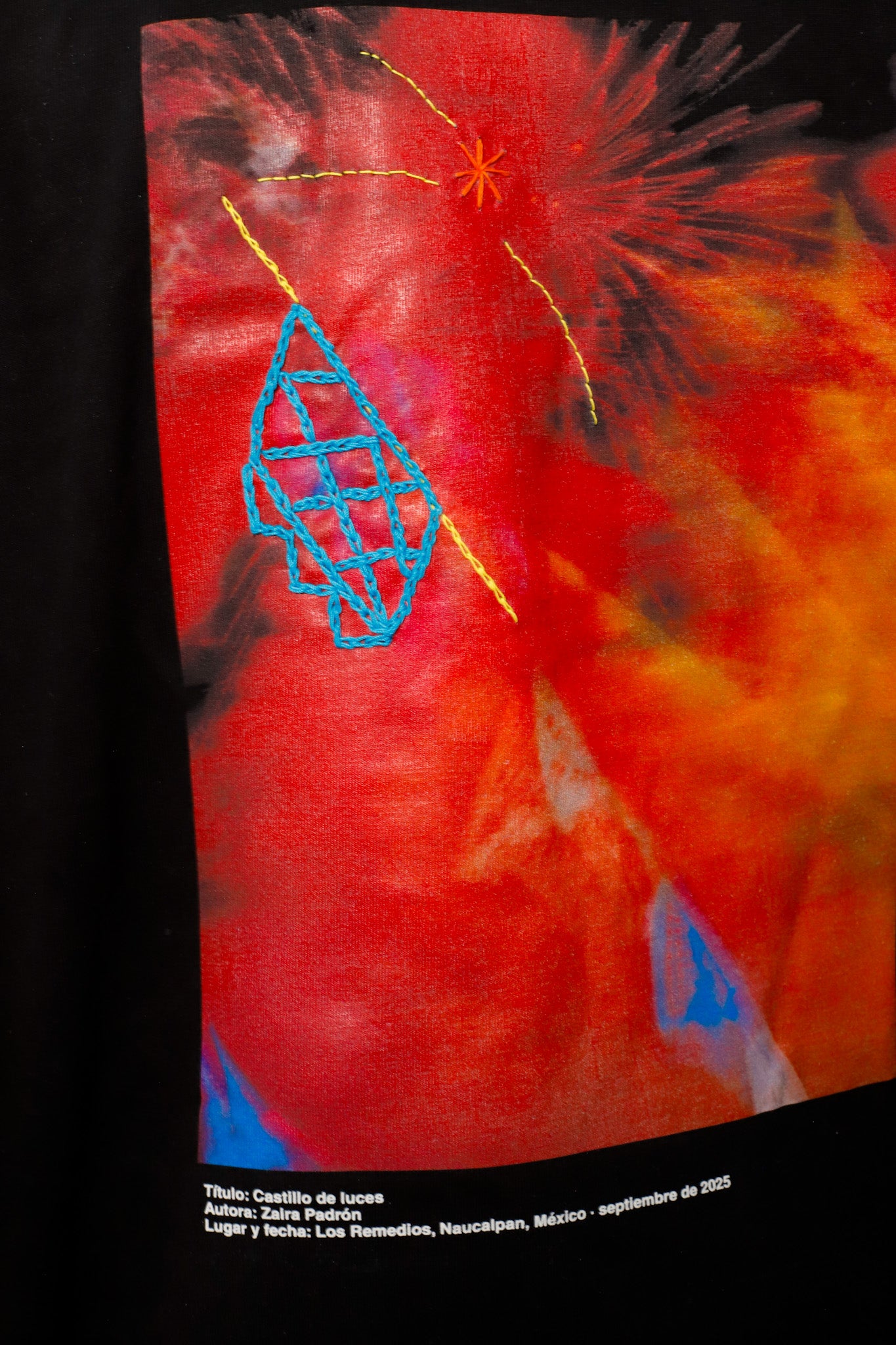 Incluye aplicación de bordado intervenida manualmente por la artista.